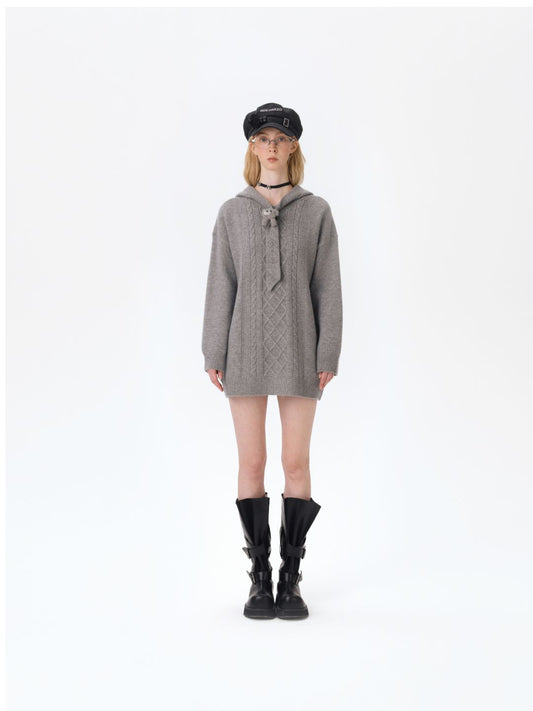 13DE MARZO Bear Knit Hoodie Dress Grey