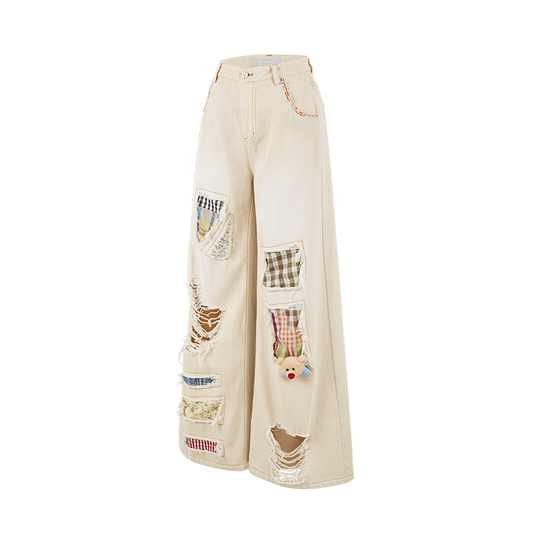 13DE MARZO Ripped Check Wide-Leg Trousers Beige