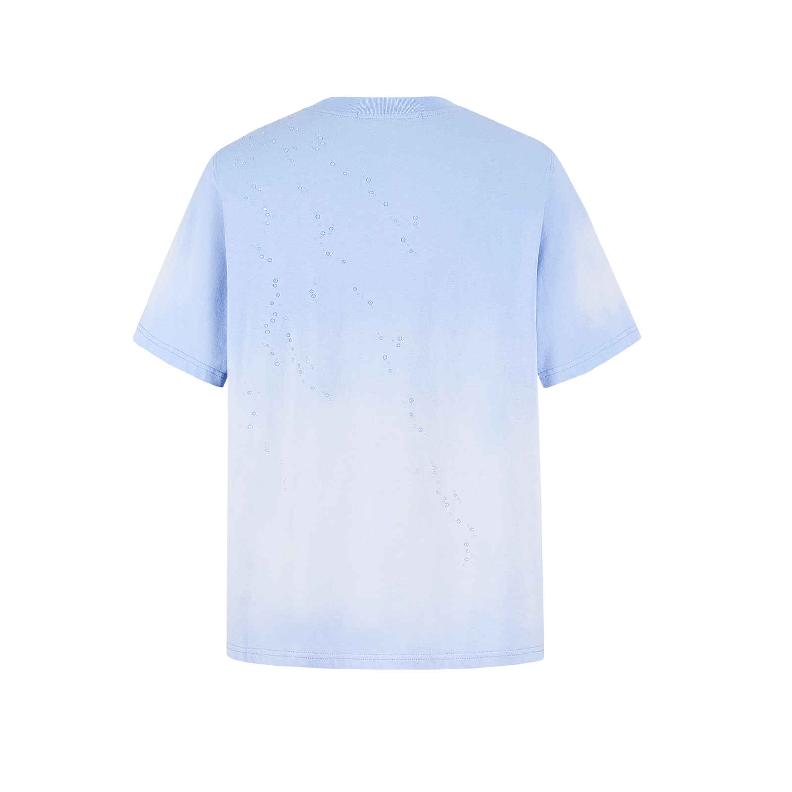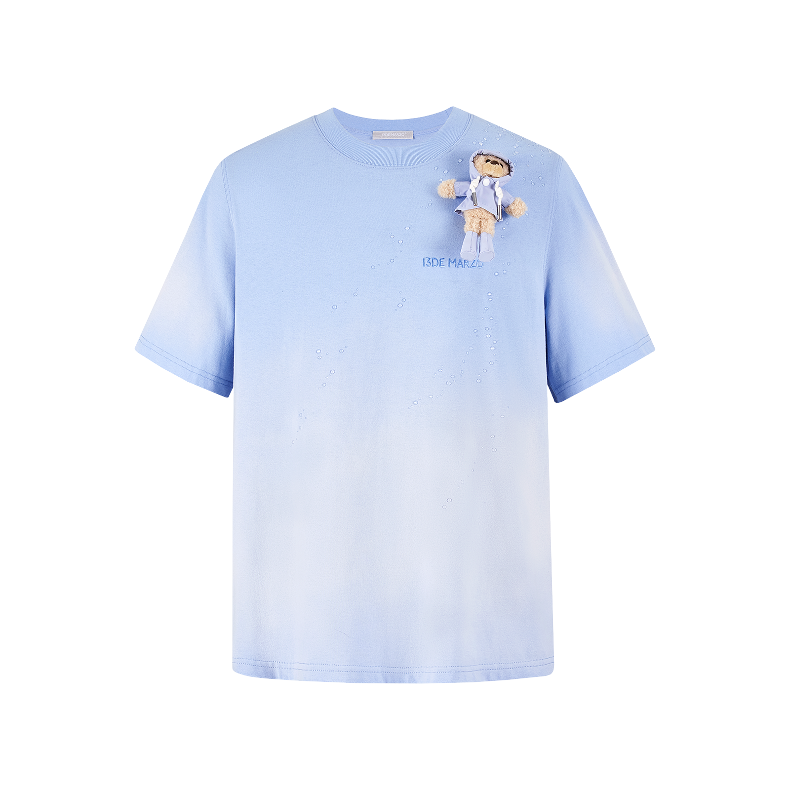 Inspired by a rainy day, this tee comes in a soft, fresh light blue as well as a versatile, edgier black. Clear heat-set crystals are scattered like falling raindrops, creating a subtle wet-weather mood. The central feature is a dimensional bear wearing a tiny raincoat—a detail that is both dedicated and cute. Finishing touches like a side label encased in translucent material ensure the design feels cohesive. With a relaxed, comfortable fit, it blends playful charm with quality construction, making it the perfect choice for capturing that rainy-day atmosphere in your outfit.