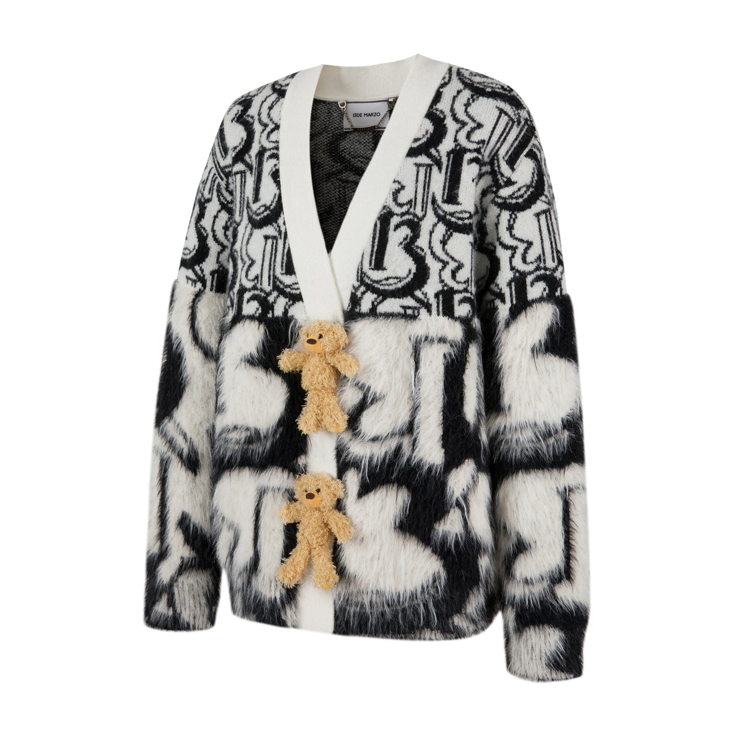 13DE MARZO Monogram Bear Button Furry Cardigan
