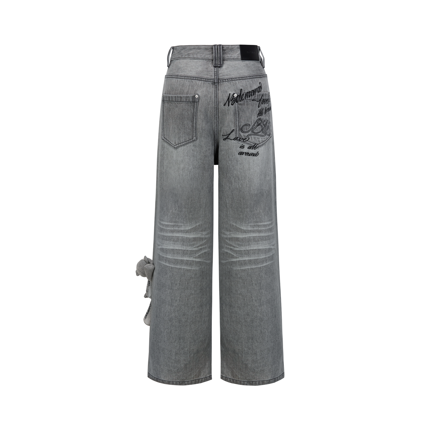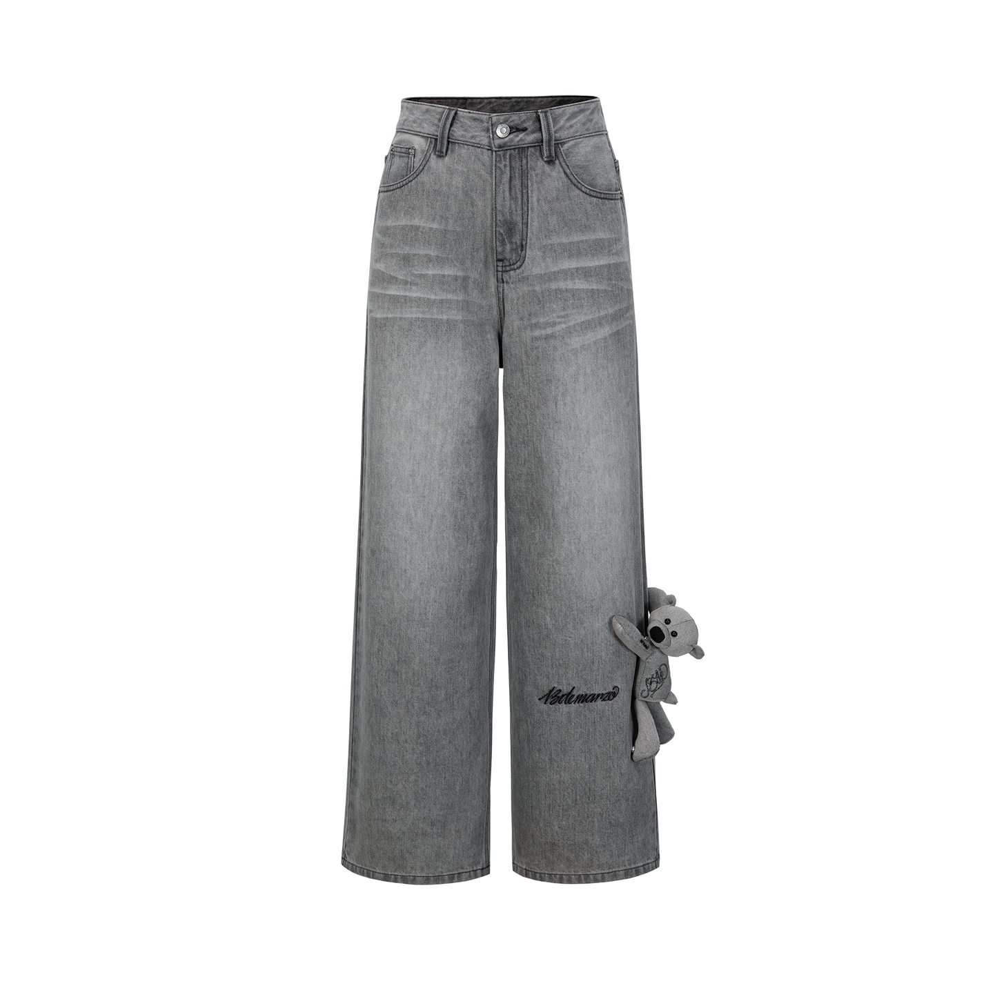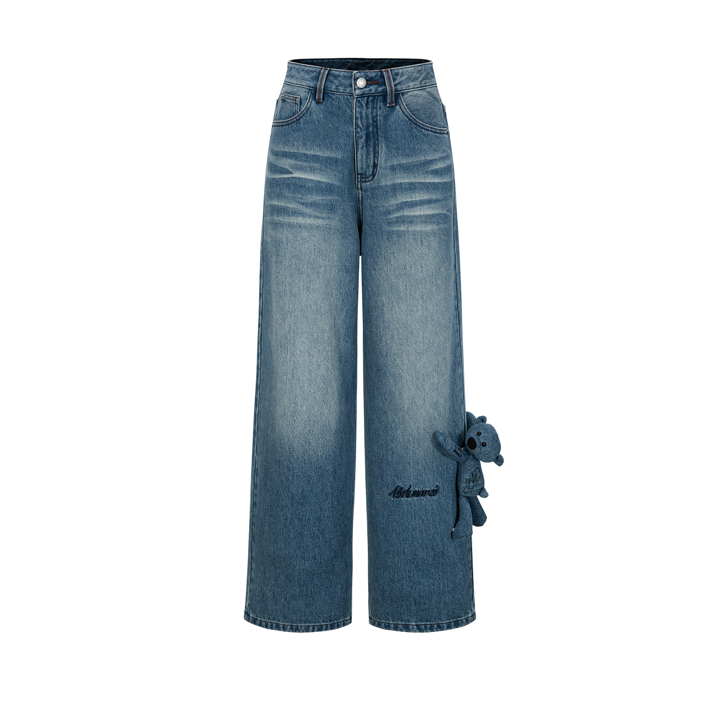 Elevate your denim game with the Logo Signature Jeans—where subtle statement meets effortless cool. Featuring a unique hand-drawn logo embroidered across the back pocket, these straight-leg jeans draw attention to refined detail. The triangle-stitch belt loops echo the casual, freehand theme of the logo, while the detachable plush bear adds a playful accent. Washed in soft, modern tones, this piece brings quiet style and comfort together, flattering your silhouette and elongating your legs.