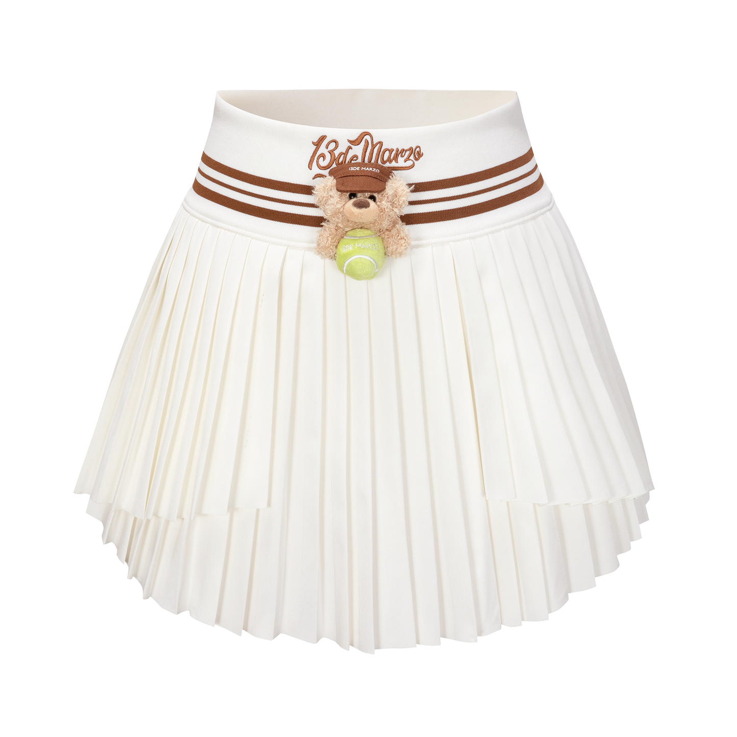 A charming plush bear holding a mini tennis ball is attached to the waistband, bringing a fun and unique brand element to the design. This piece is highly versatile and pairs effortlessly with the matching top from the same collection for a complete look.
