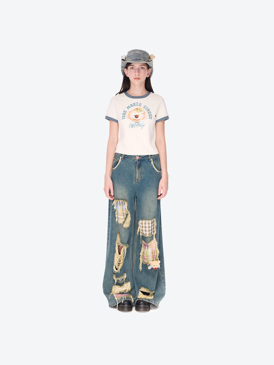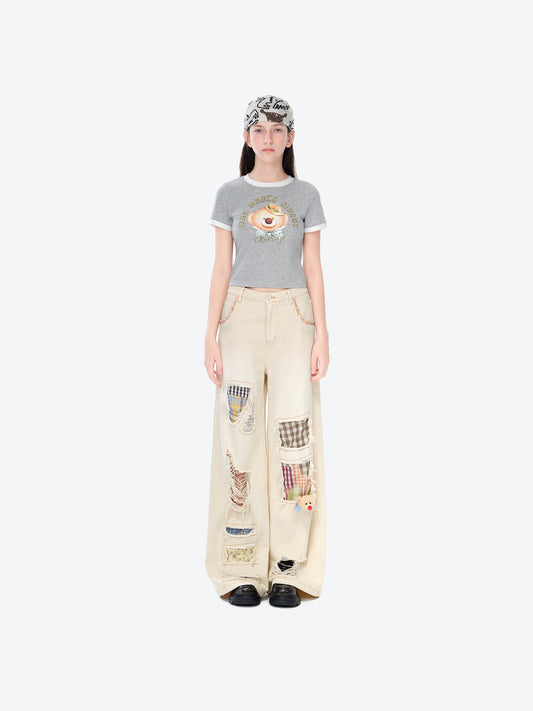 13DE MARZO Ripped Check Wide-Leg Trousers Beige