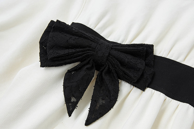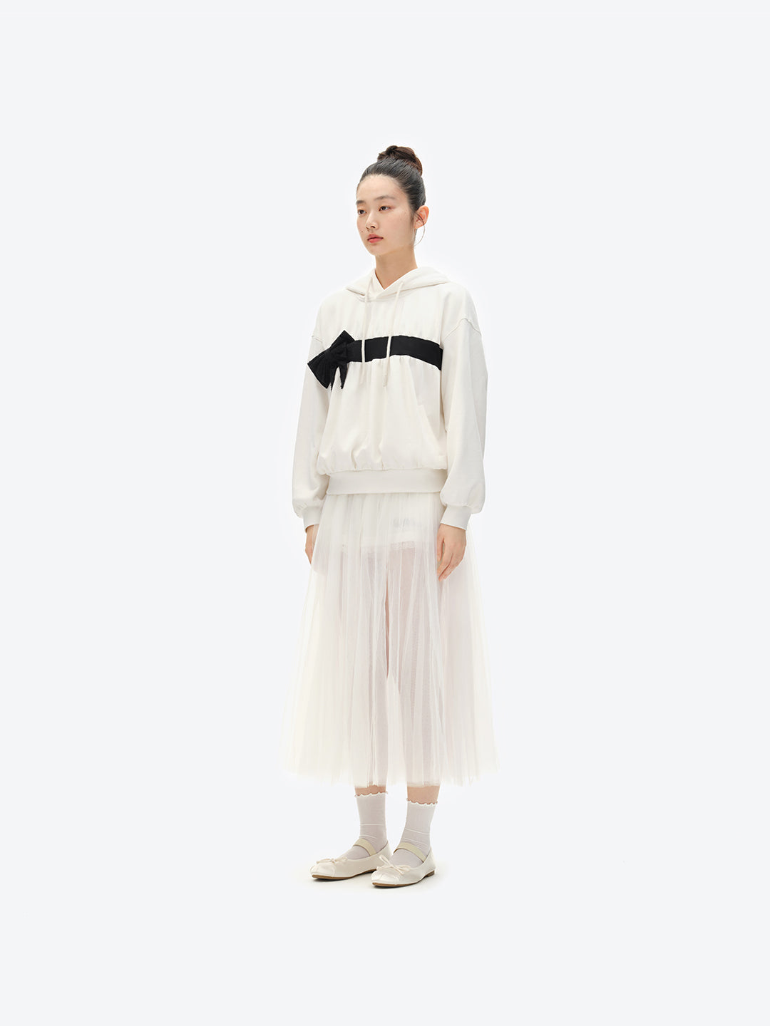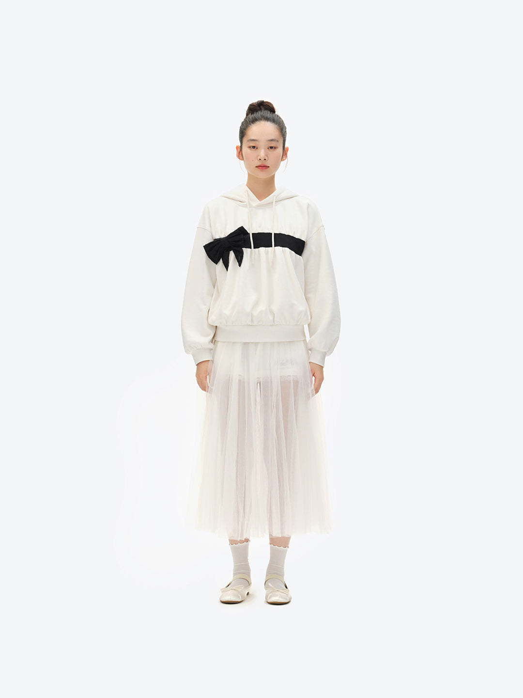The black wide woven tape across the chest serves as a defining focal point, drawing inspiration from Caroline’s signature bow-inspired aesthetic and intentionally disrupting the conventional boundaries of casual sweatwear. Distinctive cuts and graphic elements ensure that each garment balances wearability with a bold, contemporary visual language.