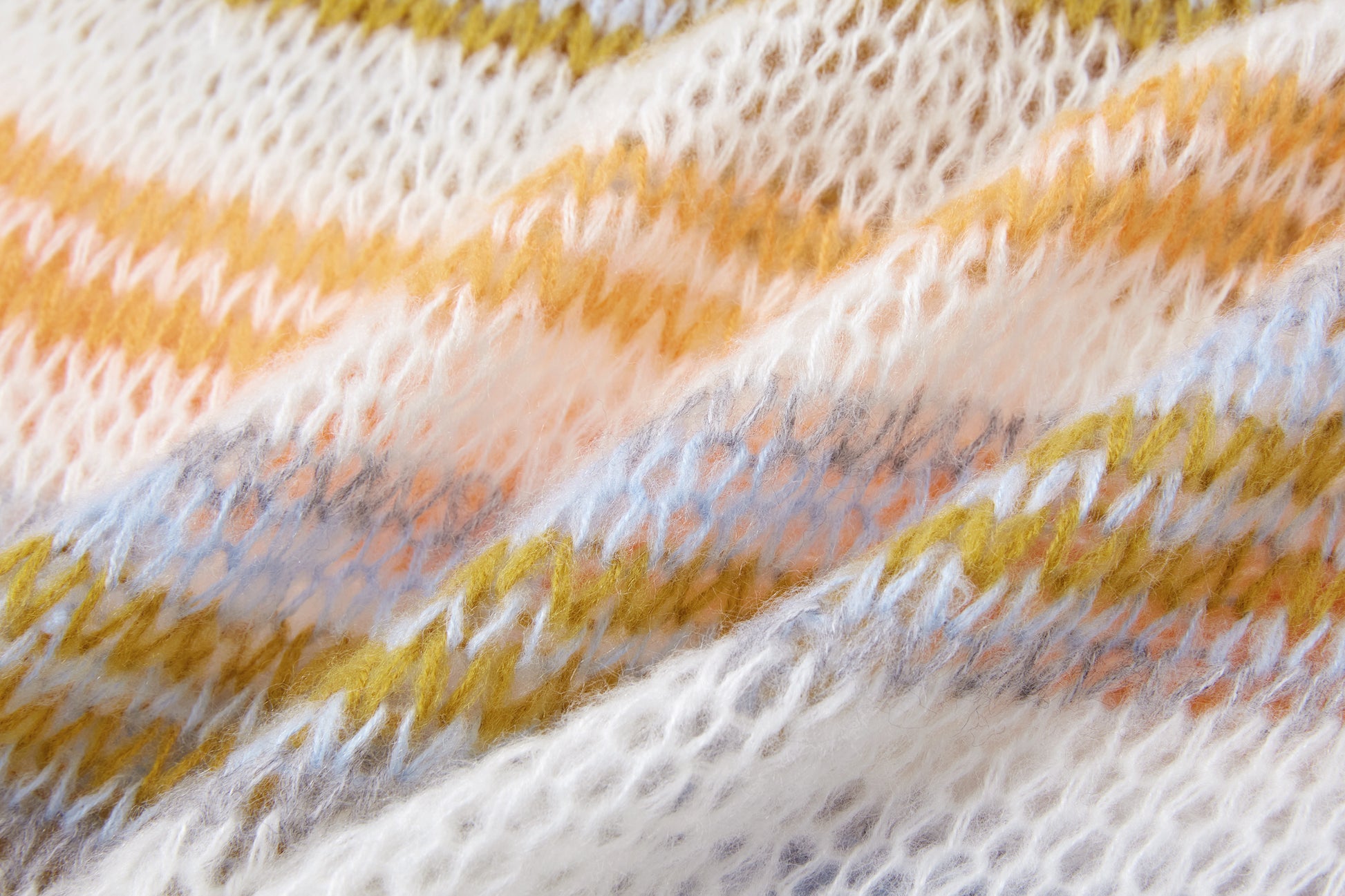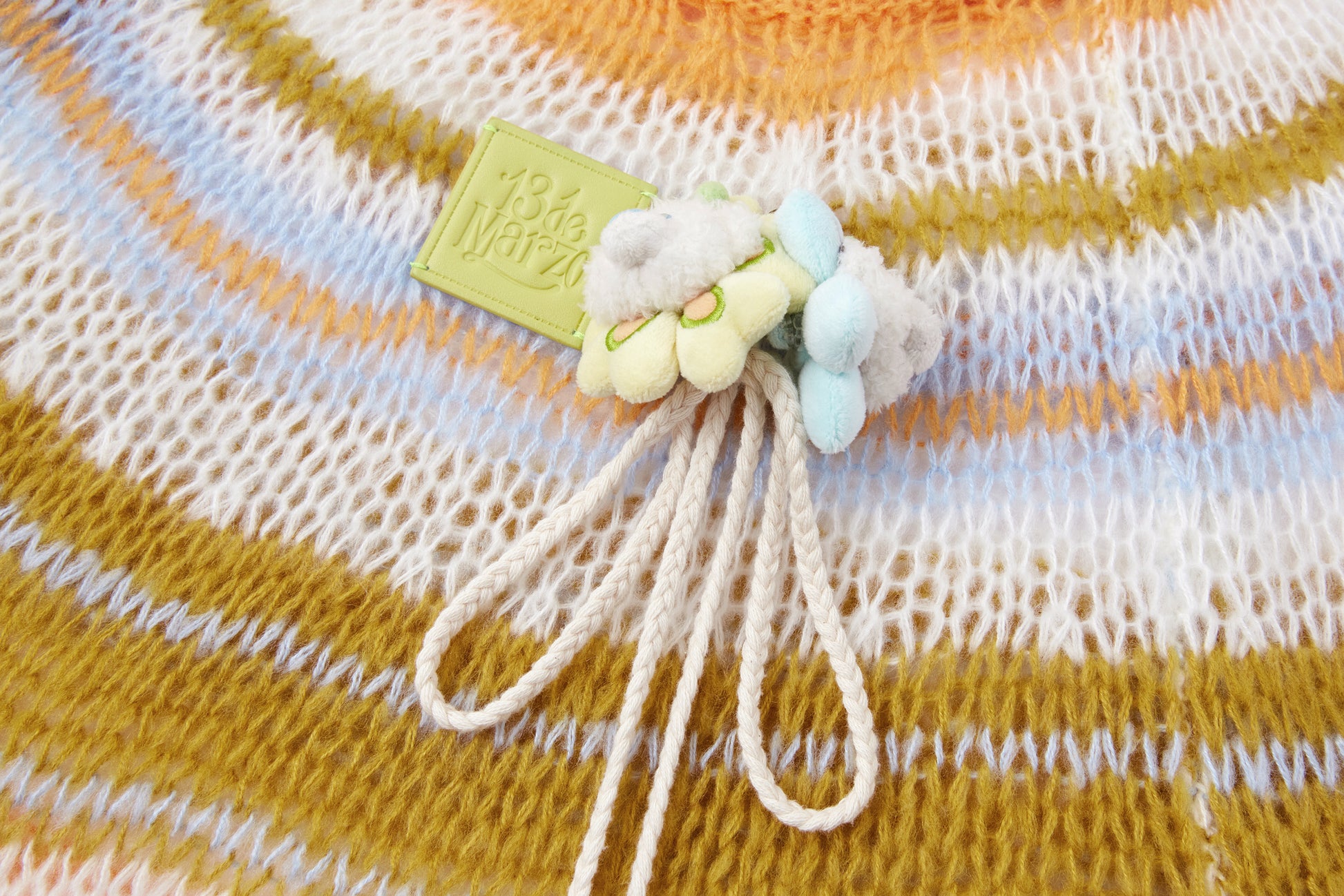 The addition of colorful stripes resembles a Provençal rainbow, breaking the calm softness with lively hues. The interplay between delicate open-knit textures and expressive stripes creates a subtle balance: when you turn, the hollow details reveal a soft sheen of skin—sensual yet refined; when you sit still, the stripes rise and fall with your breath like a warm spring breeze passing over blooming fields.