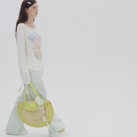 This straw tote bag, designed in the shape of a hat, seamlessly blends the fresh essence of spring with creative design. The body features a gradient weaving technique, interweaving shades of green and khaki to create a naturally textured, space-dyed pattern—as if carrying a piece of pastoral spring scenery with you. It comes with a detachable floral tie adorned with a soft doll charm, adding a playful and whimsical touch to the bag. The charm can be worn as an accent on the tote or removed to use as a separate little accessory. Combining both practicality and distinctive style, this shoulder bag is light and easy to carry, infusing any outfit with refreshing energy—perfect for daily outings or spring getaways.