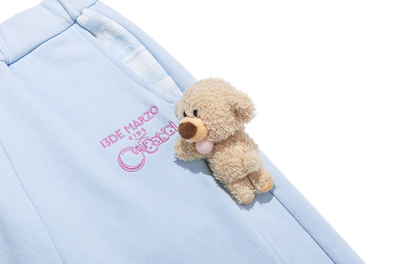 A contrast embroidered logo adds refinement and strengthens brand identity, elevating the overall fashion value of the piece. The detachable bubble-blowing teddy bear detail introduces a charming interactive element, perfectly aligned with the innocence and curiosity of children. Combining comfort, practicality, and delightful storytelling, these sweatpants offer both style and joy for everyday wear.