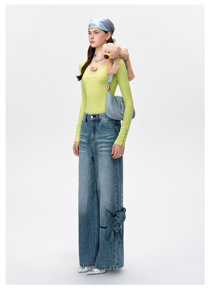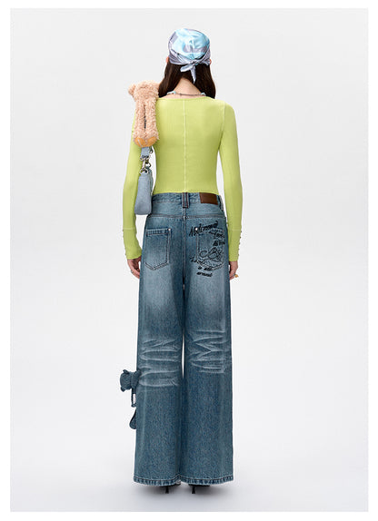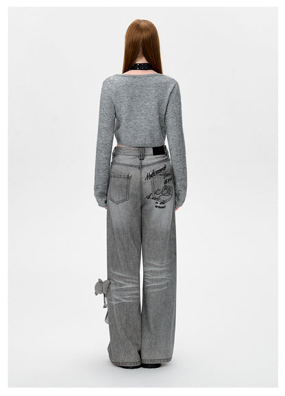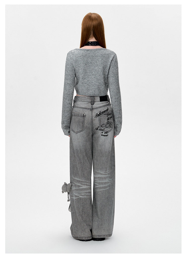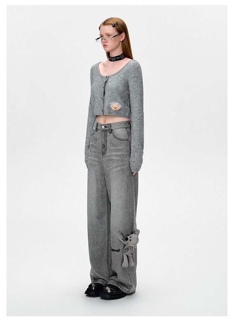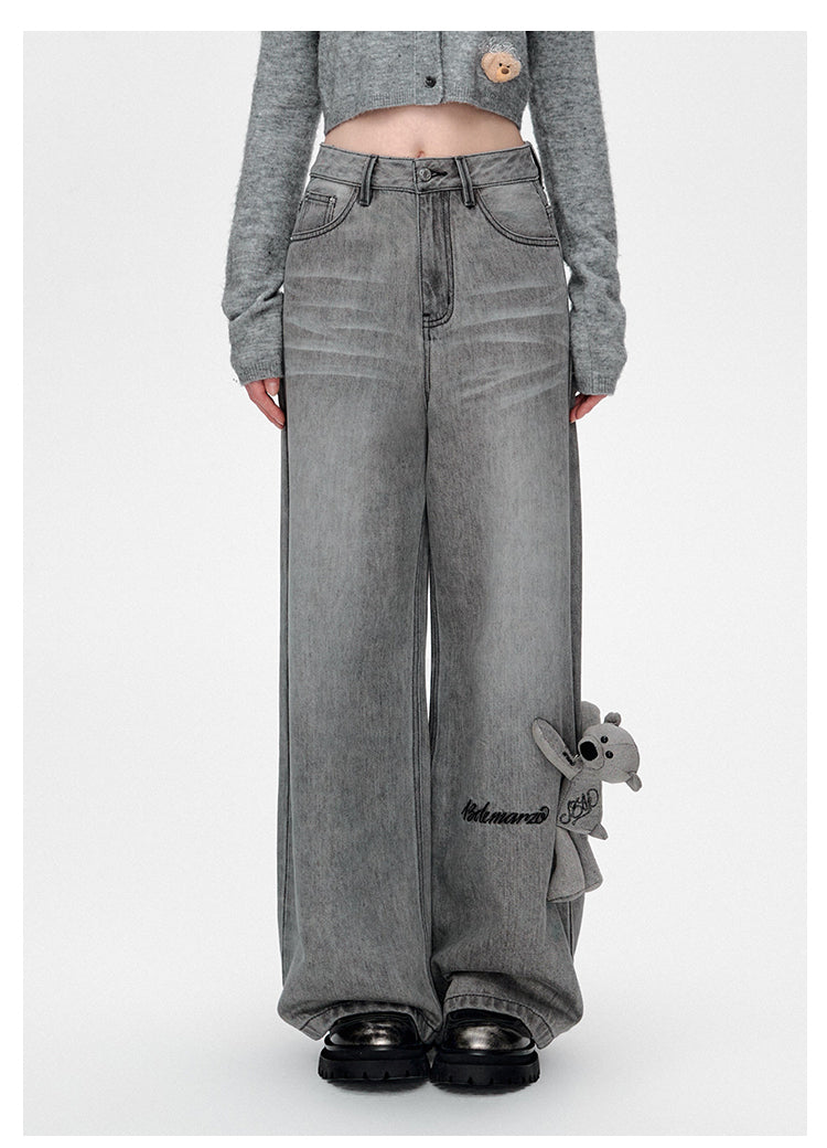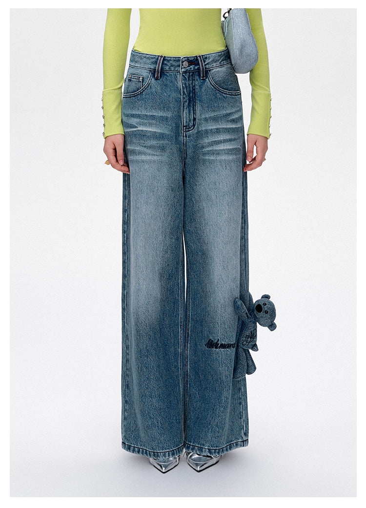 Elevate your denim game with the Logo Signature Jeans—where subtle statement meets effortless cool. Featuring a unique hand-drawn logo embroidered across the back pocket, these straight-leg jeans draw attention to refined detail. The triangle-stitch belt loops echo the casual, freehand theme of the logo, while the detachable plush bear adds a playful accent. Washed in soft, modern tones, this piece brings quiet style and comfort together, flattering your silhouette and elongating your legs.