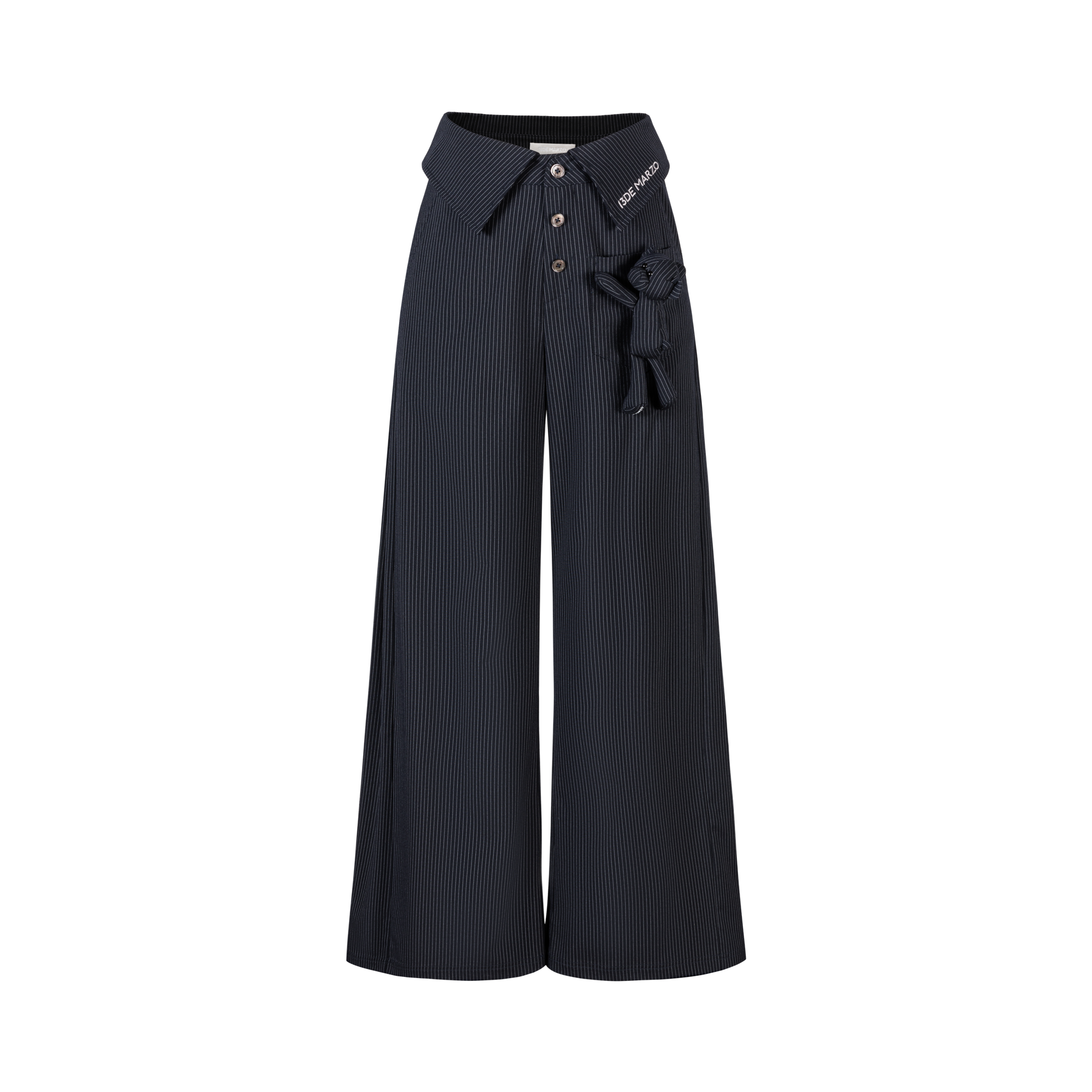 Two three-dimensional teddy bear details run along the body and can be detached and repositioned on the sleeves or pant legs, allowing for flexible styling options. By blending refined detailing with the comfort of casual tailored trousers, this design balances sophistication and fun. Ideal for everyday wear or statement styling, it easily becomes a standout piece in any outfit.
