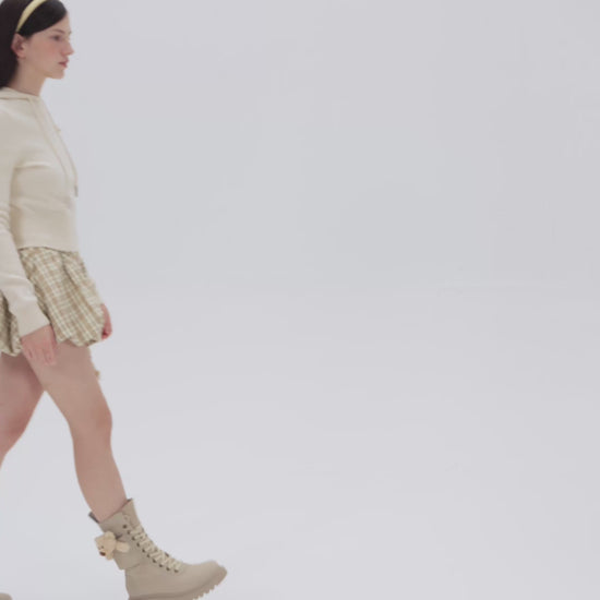 Design Concept: These work boots feature a platform sole that adds 4.5 cm of height, lifting and sculpting the leg silhouette. The design includes functional 3D side pockets that blend utility with style, while a low-saturation color palette ensures versatile pairing with various outfits. A detachable bear-head charm tucked inside the pocket adds playful customization and personality to the look.