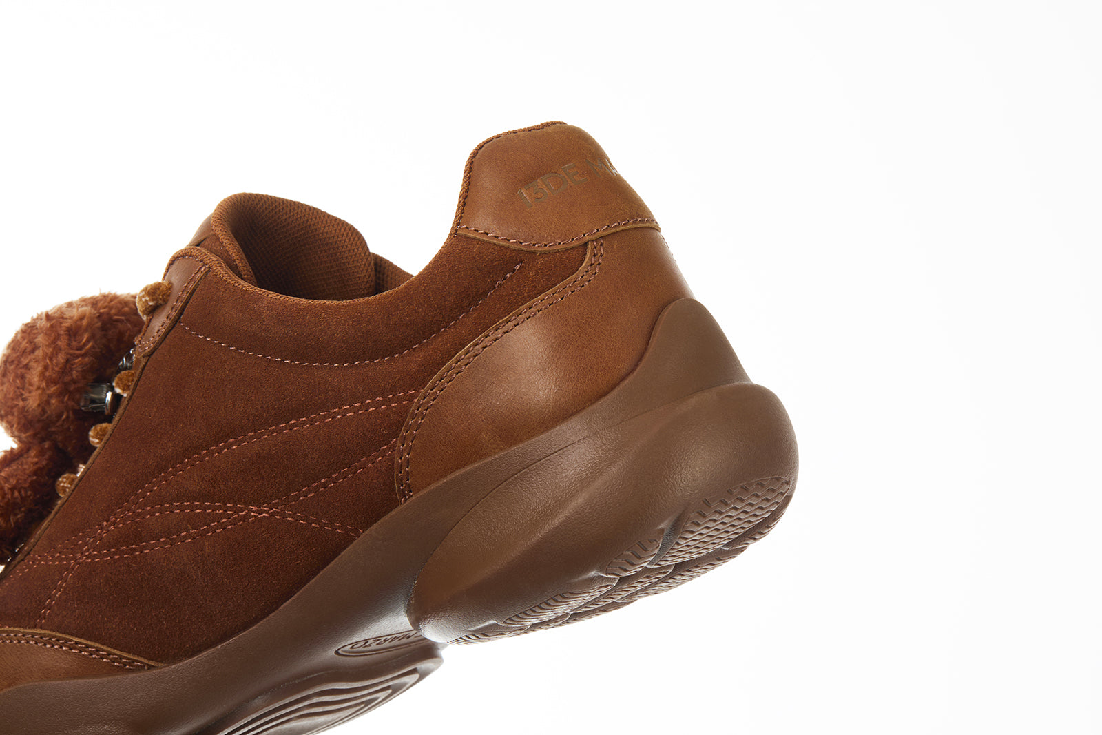 Design Concept: These sneakers feature a sole inspired by a bear paw print, adding a playful yet distinctive touch to the silhouette. The upper incorporates the brand's signature TPU numeric detailing for enhanced texture and dimension. The overall finish is intentionally distressed, blending a retro aesthetic with contemporary style. A detachable bear-head charm adds a customizable and whimsical element to the design.