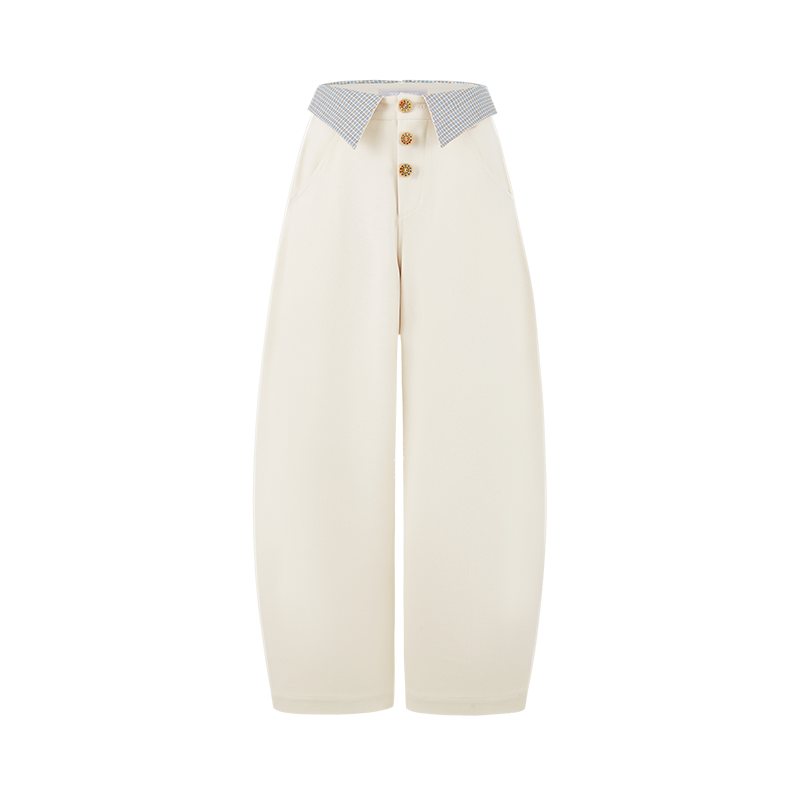 A playful clown teddy bear charm is attached at the top of the suspenders, introducing a lively and whimsical accent that becomes a standout design highlight. The trousers are ideal for those drawn to artistic or casual styling, suitable for daily outings or relaxed gatherings. Thoughtful details—such as pleats and contrasting plaid shirt-collar paneling—break up the solid base and add visual interest. Balancing comfort, practicality, and design, this piece reinterprets classic suspenders trousers with a modern, character-driven approach.