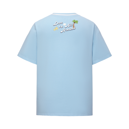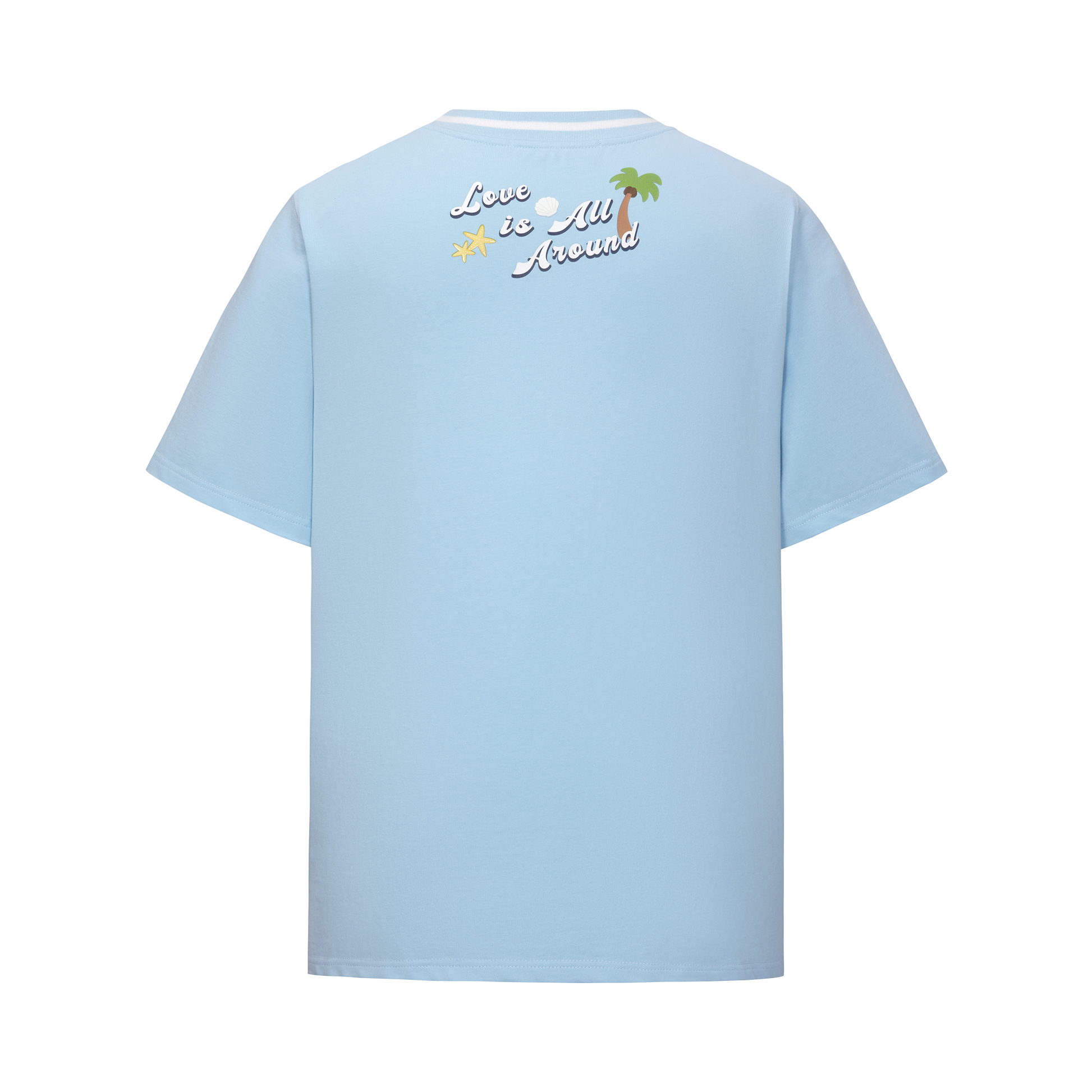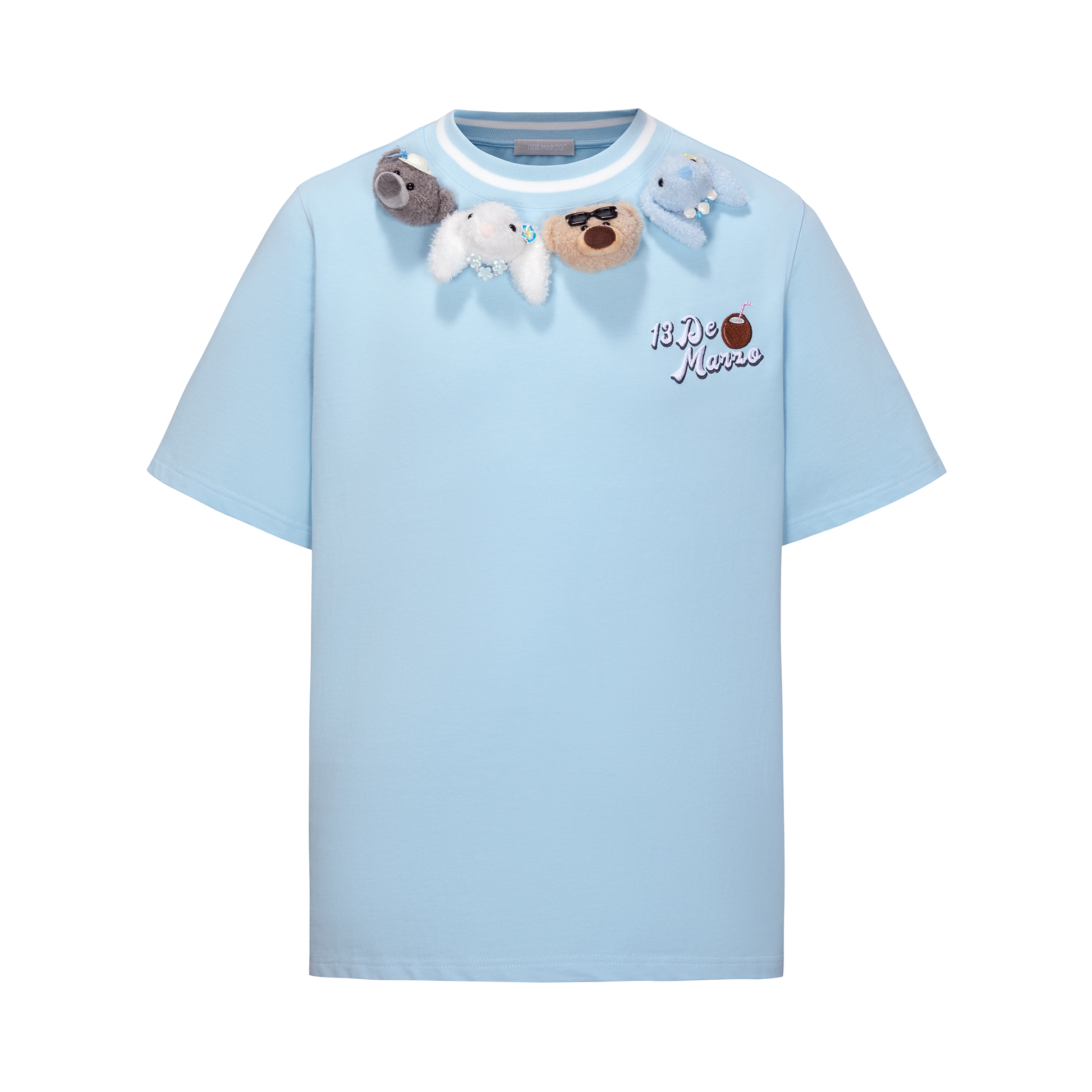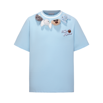 This woven short-sleeve top features custom white jacquard ribbing with coconut tree and starfish motifs, creating a refreshing ocean vibe. Four playful plush figures and island-inspired accessories add a fun and lively touch.