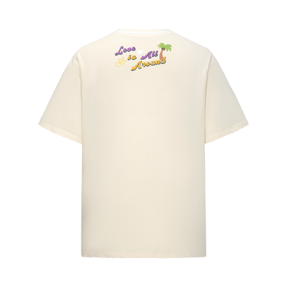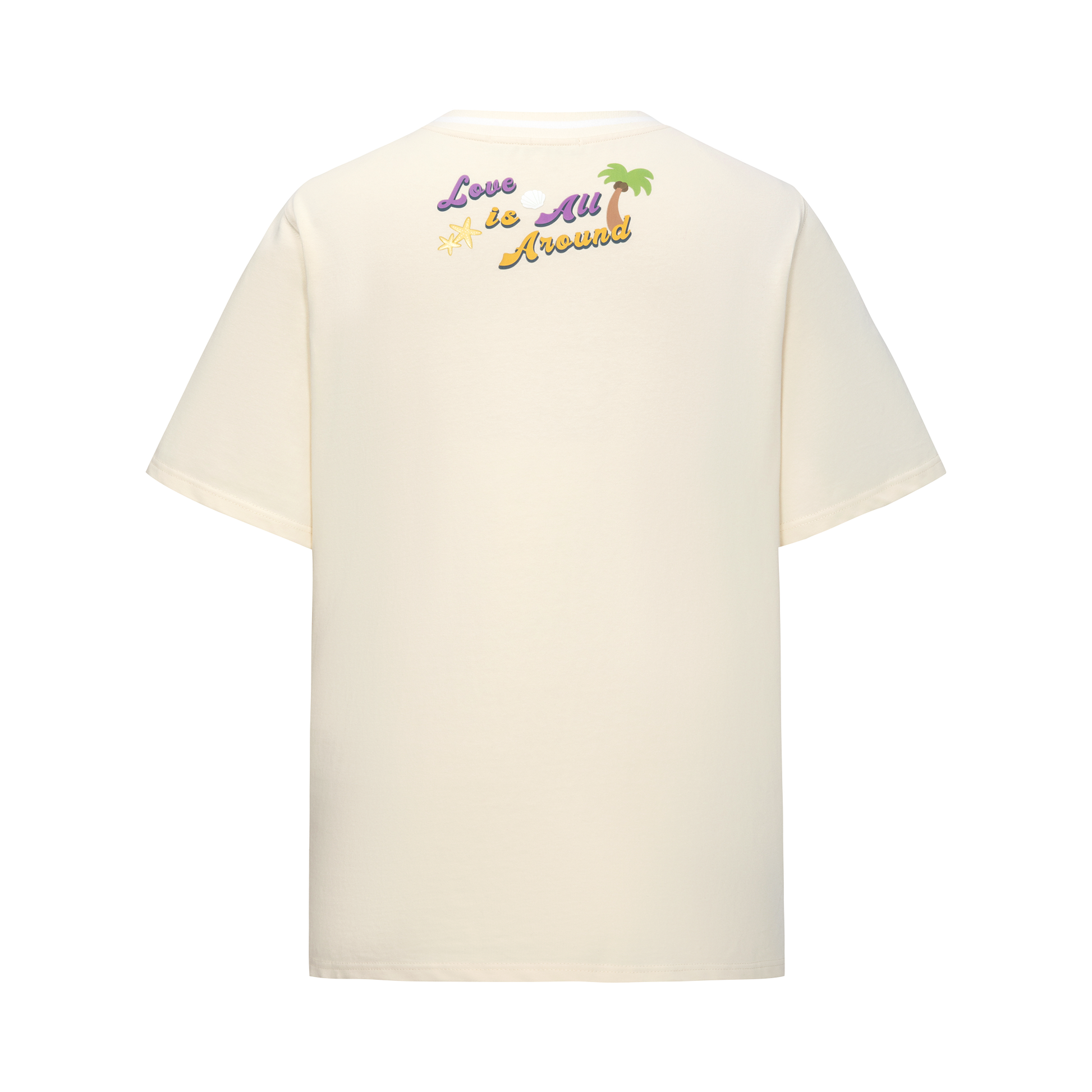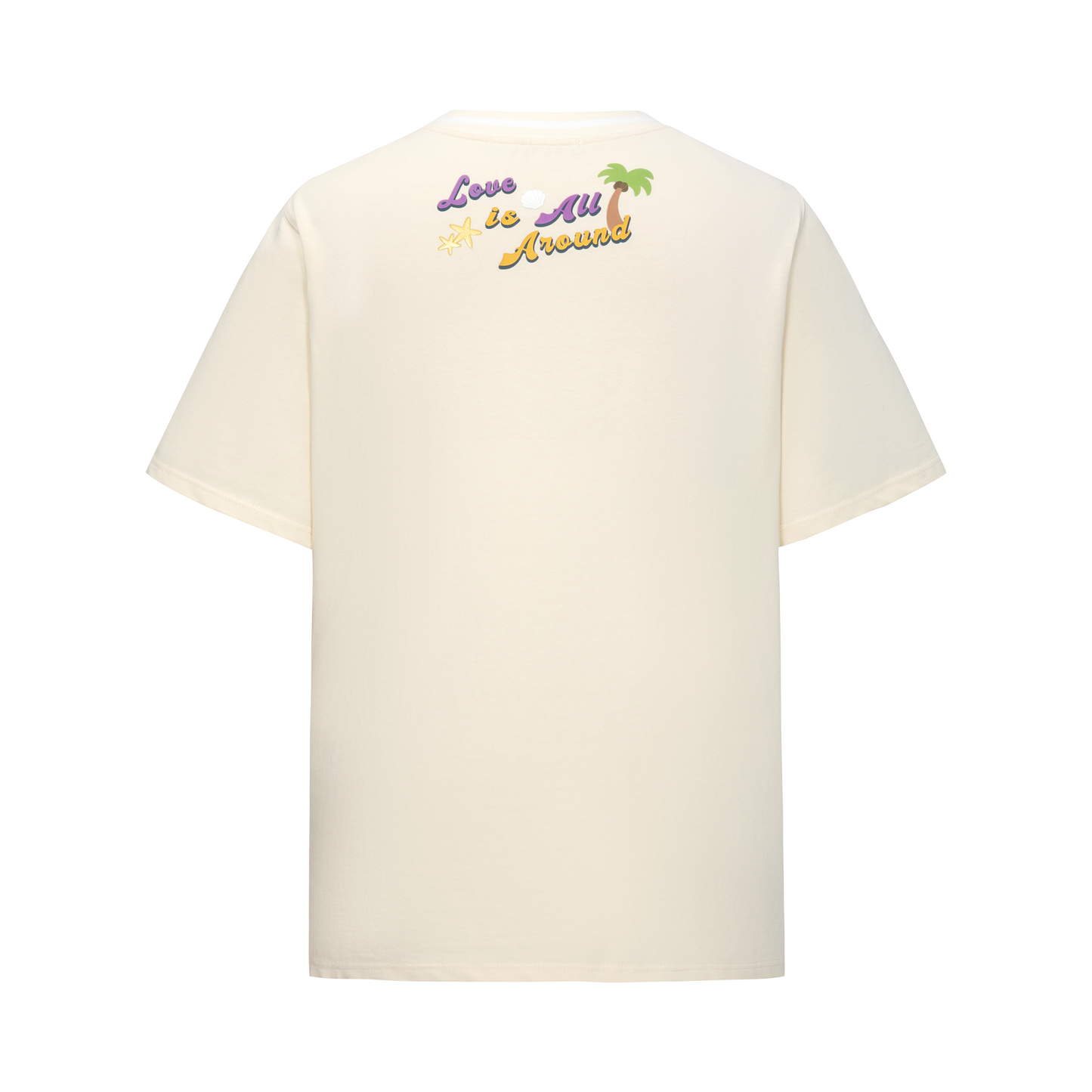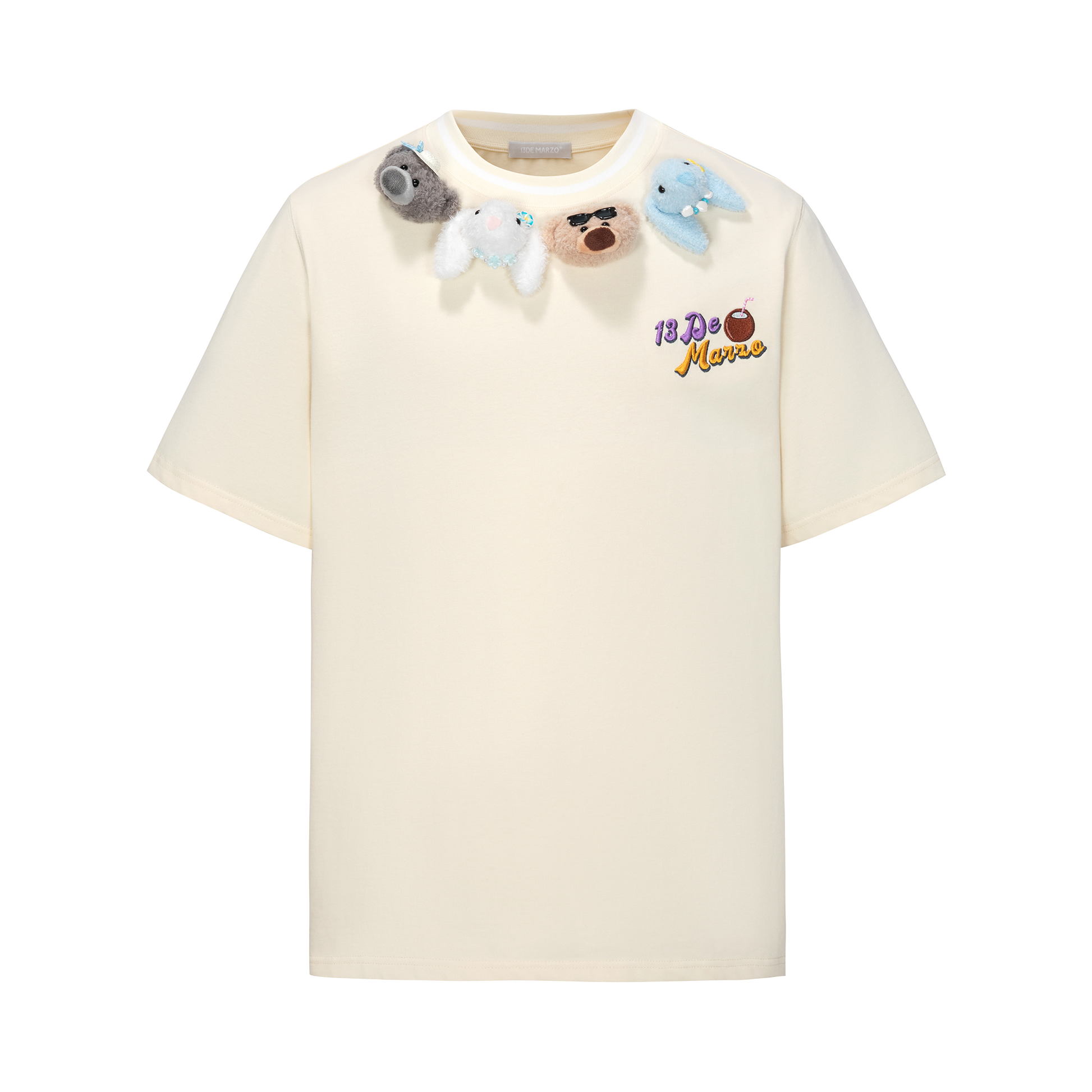 This woven short-sleeve top features custom white jacquard ribbing with coconut tree and starfish motifs, creating a refreshing ocean vibe. Four playful plush figures and island-inspired accessories add a fun and lively touch.