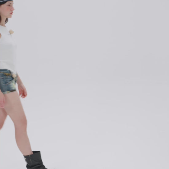The silhouette features a cropped, fitted cut that flatters the legs, visually elongating the proportions and accentuating the wearer's figure with youthful energy and subtle allure. Rooted in the retro edgy aesthetic, this piece blends Y2K elements with American vintage vibes, effortlessly adapting to a range of styling scenarios. Whether paired with a cropped top for a sweet-grunge look or styled with statement boots for a punk edge, it delivers versatility and attitude.