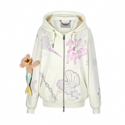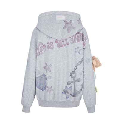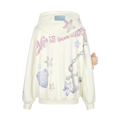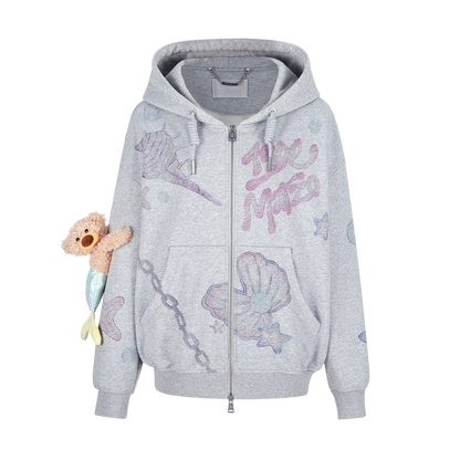 This hoodie brings a dreamy ocean world to life with whimsical, vibrant illustrations that create a striking yet harmonious visual impact. Crafted from high-quality fabric and designed in a relaxed, loose fit, it ensures maximum comfort and freedom of movement—ideal for both casual outings and laid-back sportswear. The ocean graffiti design expresses a carefree and bold fashion attitude, while the playful mermaid bear adds a touch of creative charm. Complete with a detachable plush bear accent, this hoodie blends art and comfort, as if letting you hear the whispers of waves and feel the breeze of the sea.