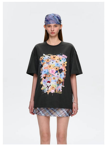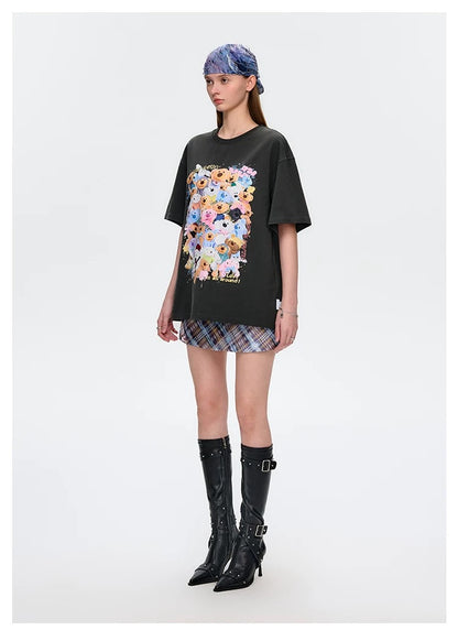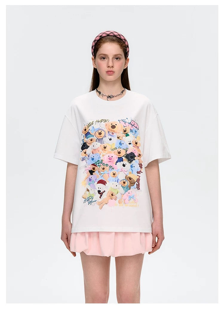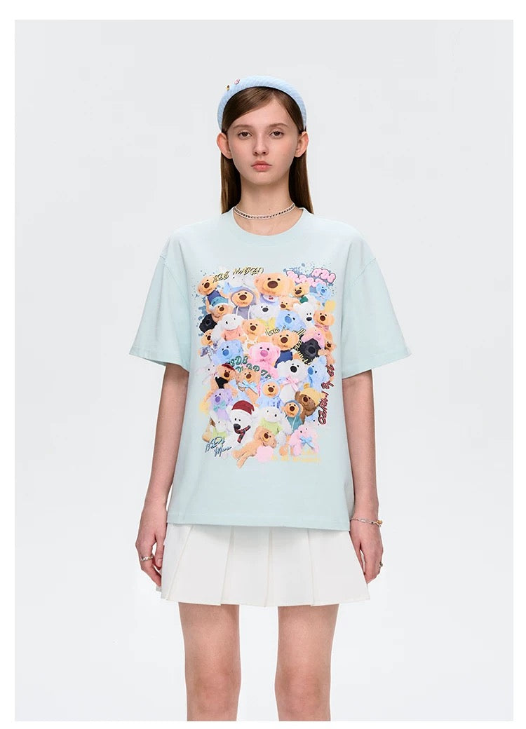 This classic loose-fit short sleeve tee features the brand’s iconic playful doll characters, each dressed uniquely with stylish hats, cozy scarves, and flashy shirts. Printed with a variety of patterns and texts, these characters look like they’re attending a lively party, blending cuteness with personality. Made from soft, pure cotton fabric, the relaxed fit ensures all-day comfort, while the charming prints make this tee a must-have fashion piece.