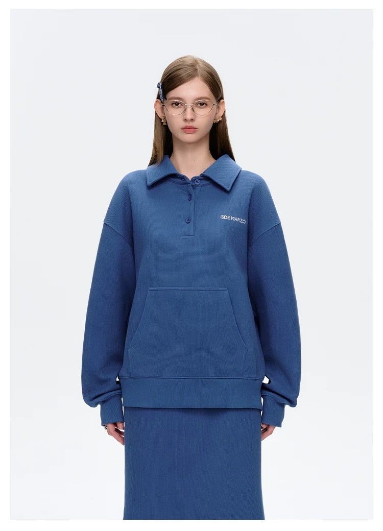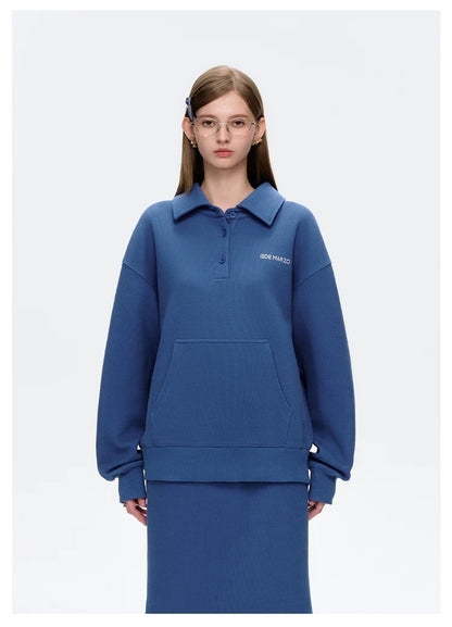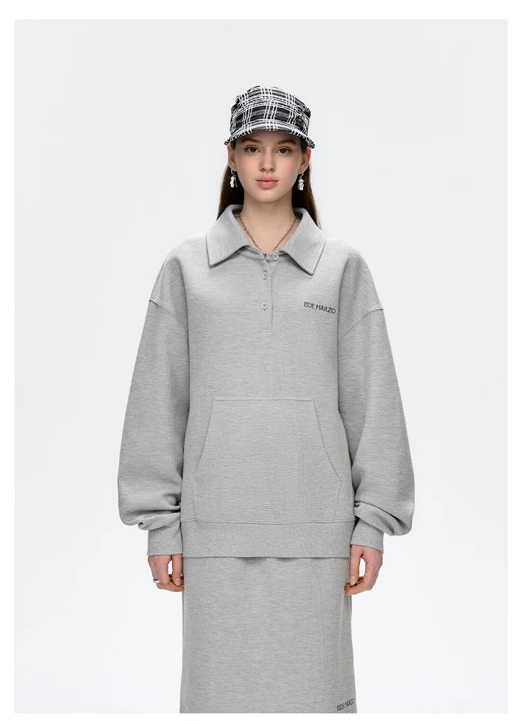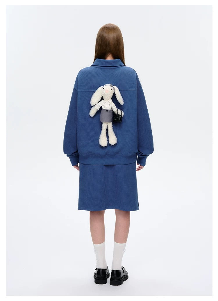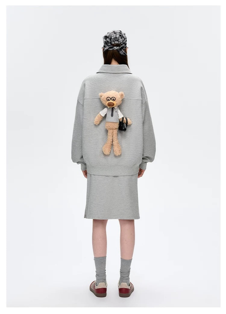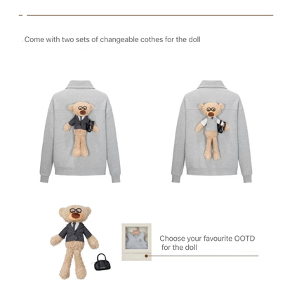 This polo collar sweatshirt blends classic elegance with modern creativity. The loose fit offers comfort and versatility, ideal for both casual and semi-formal settings. A standout feature is the detachable bear on the back, complete with an extra outfit for a fun, office-themed style twist. A perfect mix of sophistication and playful design.
