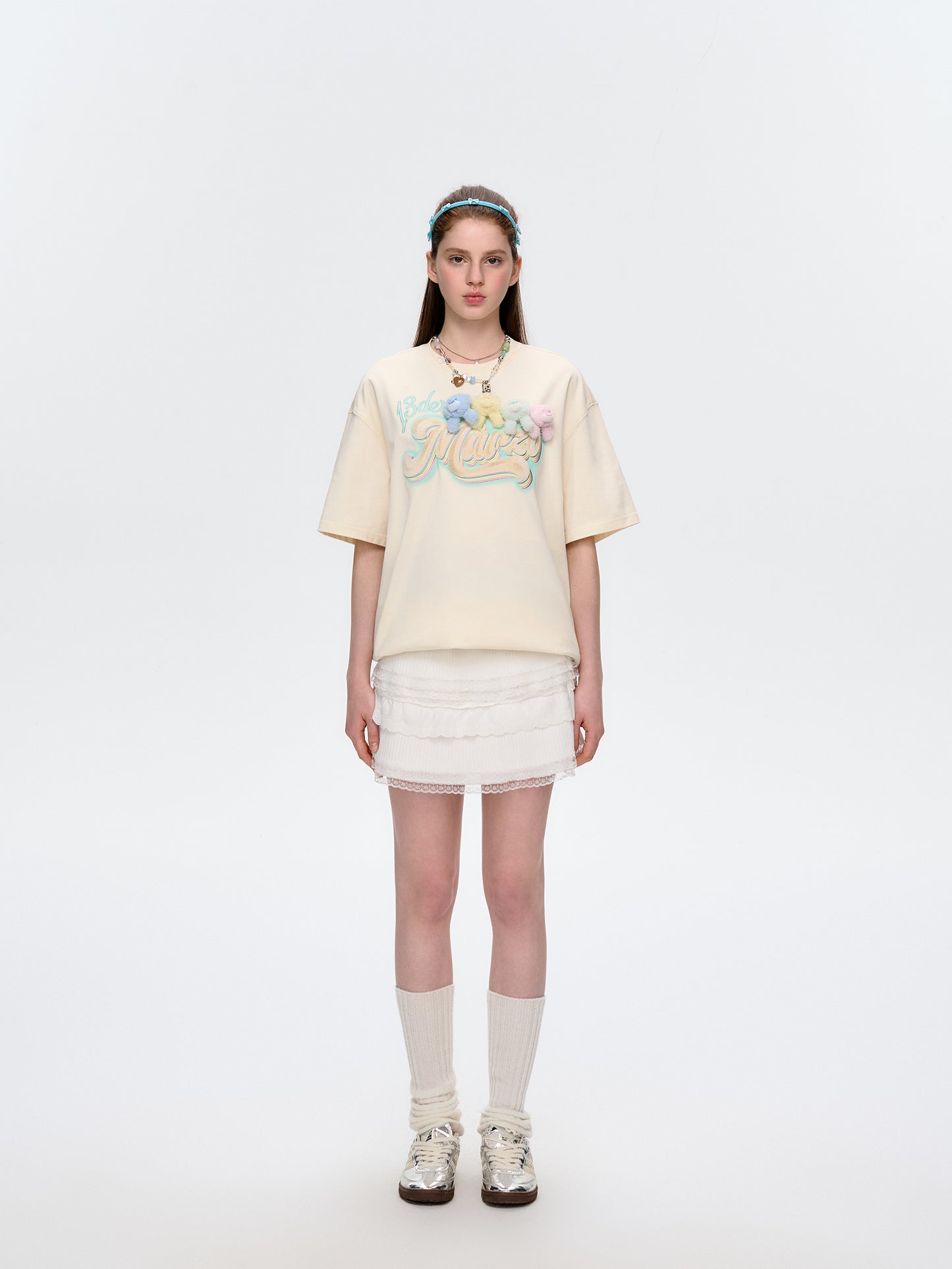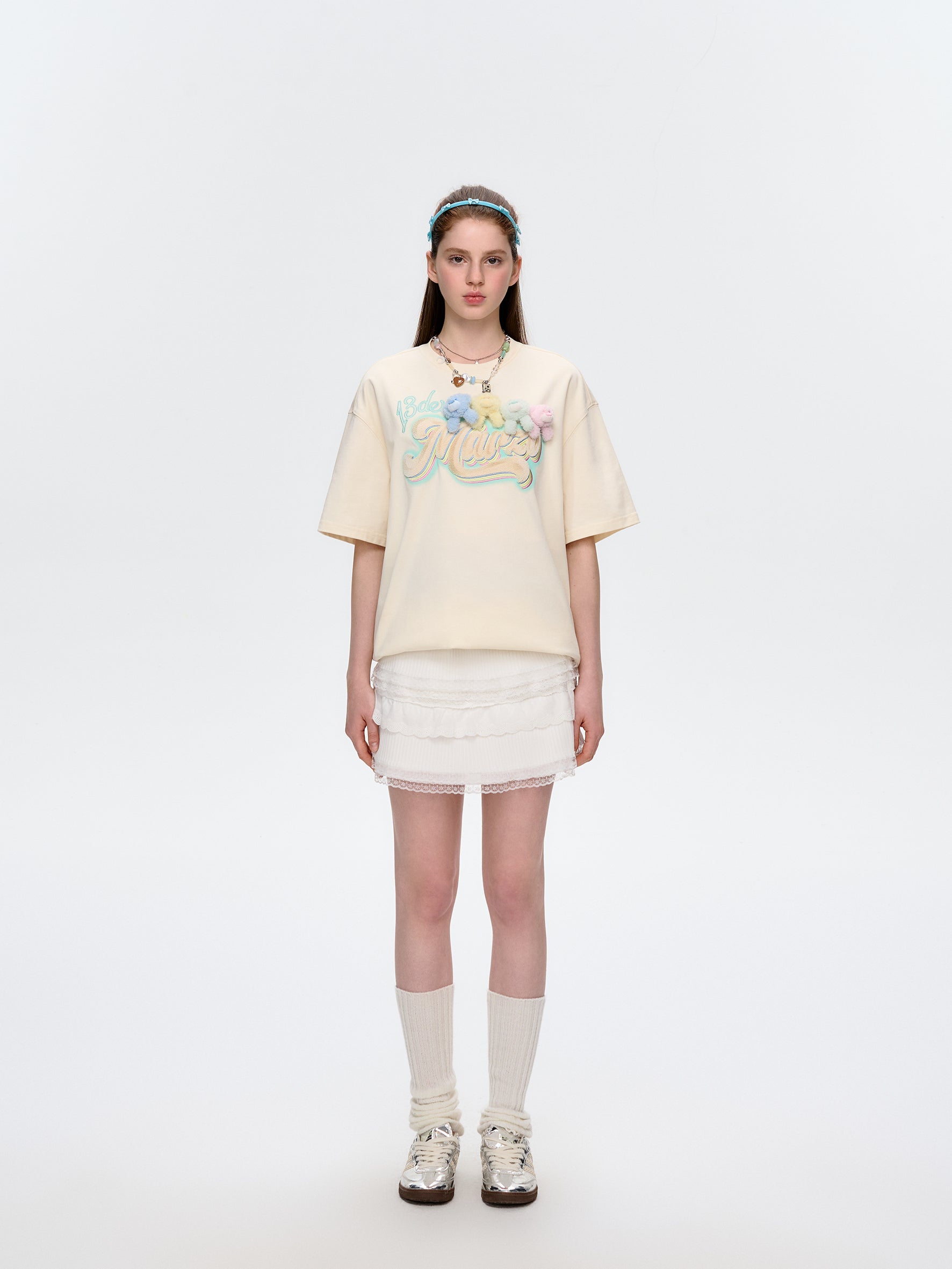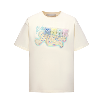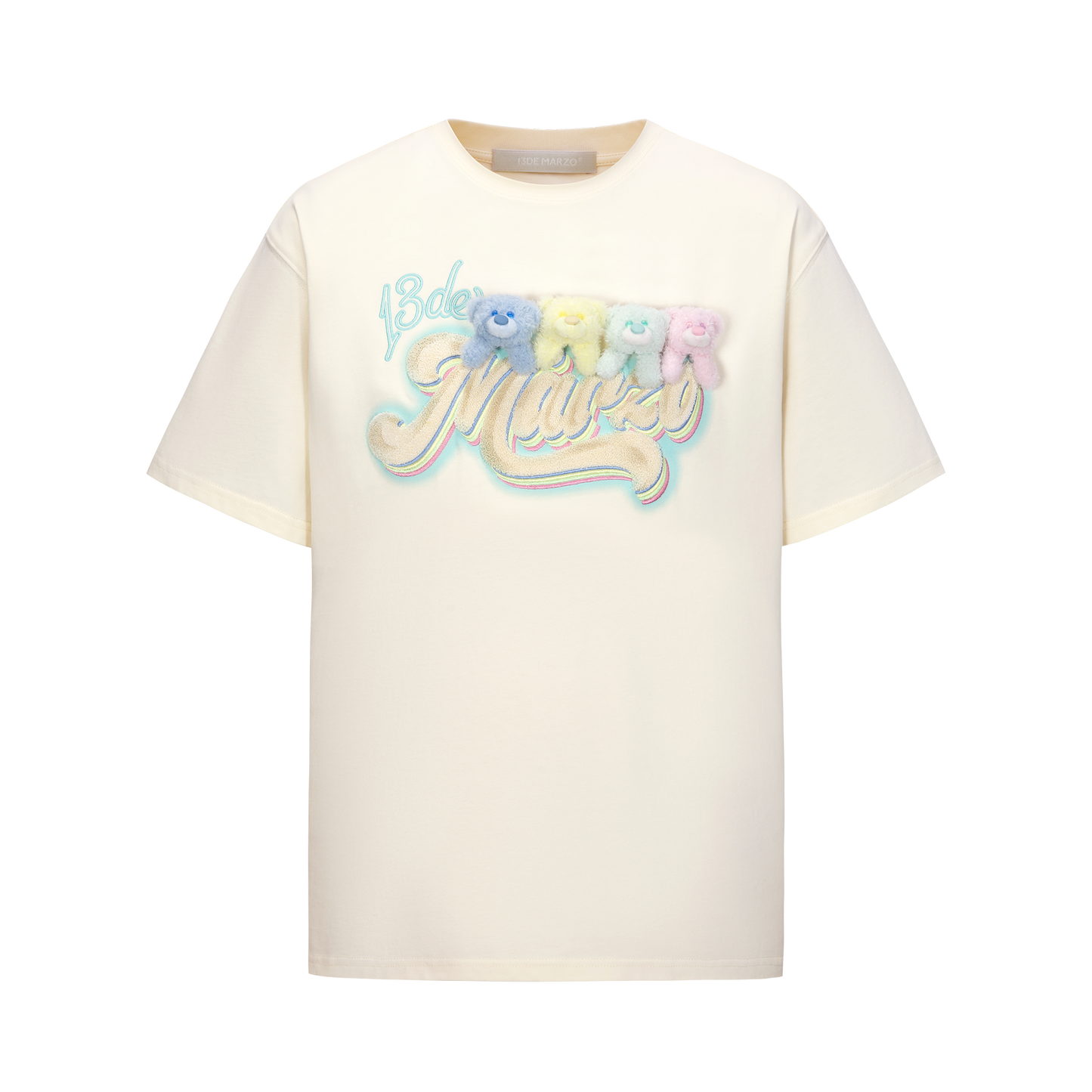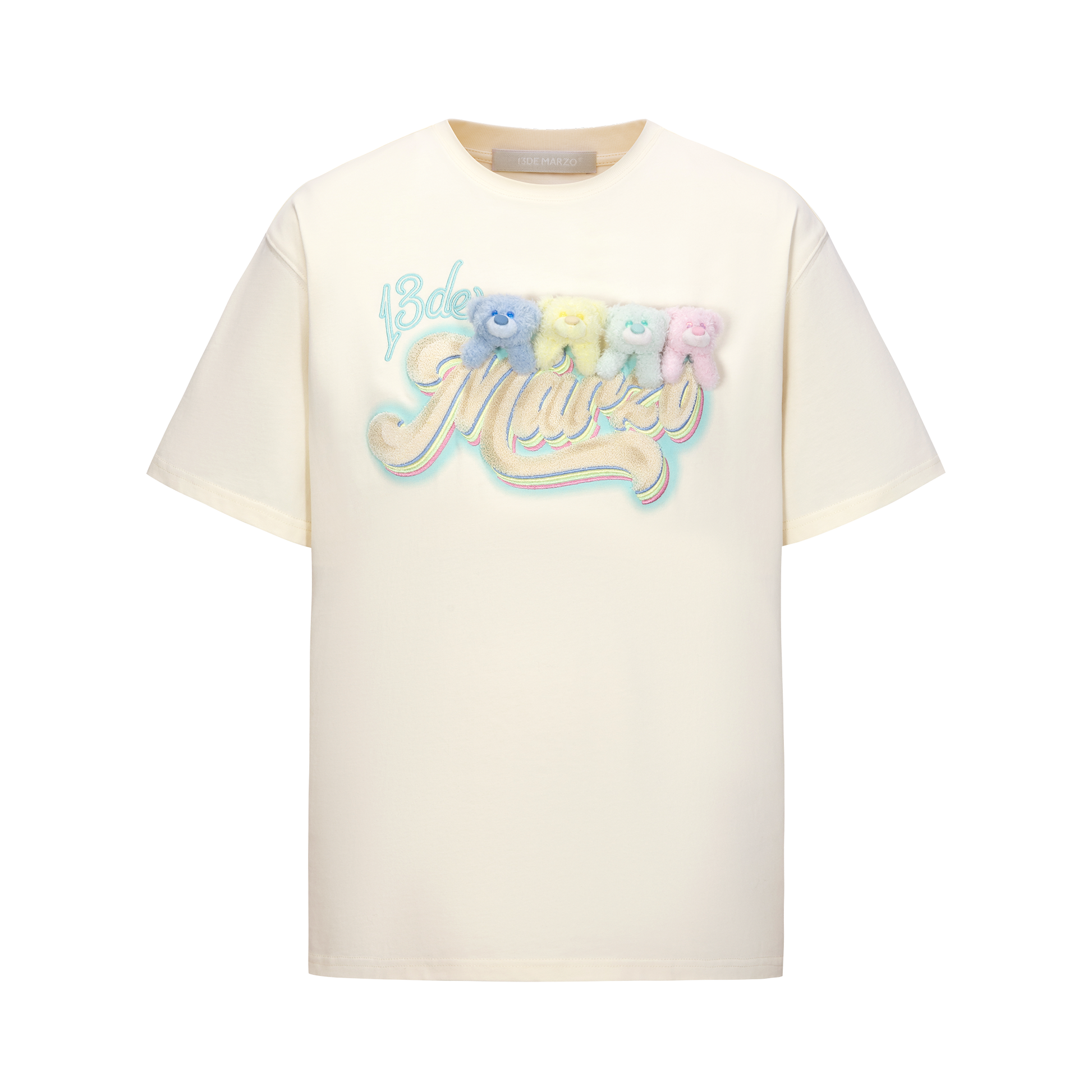 This loose-fit T-shirt features a playful design with four colorful detachable bears on the chest. Crafted with 3D toothbrush embroidery and mixed techniques, it adds texture and visual impact. The vivid logo and bear colors echo each other, creating a dopamine-boosting, cheerful style. Comfortable and easy to wear.