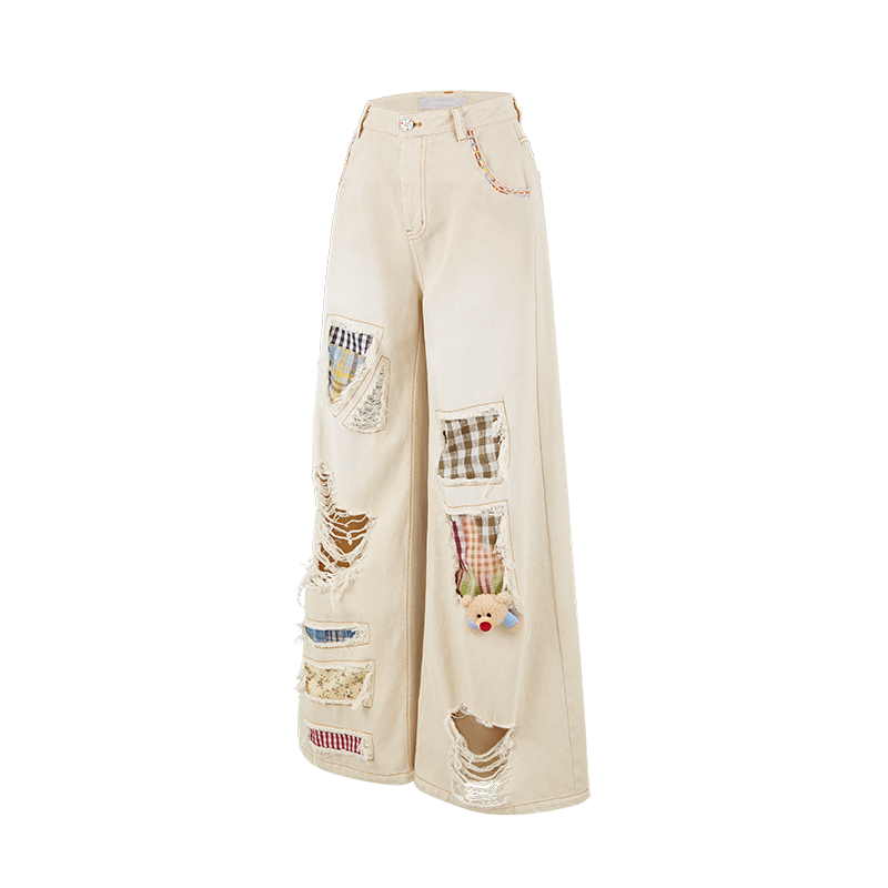 This wide-leg pant is designed to break the monotony of traditional jeans by blending multiple fashion elements into a boldly individualistic statement piece. Its relaxed, wide-leg silhouette aligns with the current trend of comfortable chic while flattering a variety of body types. The deconstructed patchwork design, inspired by street culture and retro aesthetics, combines different fabrics and patterns to create rich visual texture and a unique artistic vibe. The addition of playful patches and a detachable doll charm injects a dose of whimsy, making the style even more multifaceted. Embroidered text on the back pockets serves as the perfect finishing detail, elevating the design's sophistication and perceived quality. Available in two classic colors, it meets core wardrobe needs while offering versatile styling possibilities—perfect for any occasion that calls for fashion-forward personality.