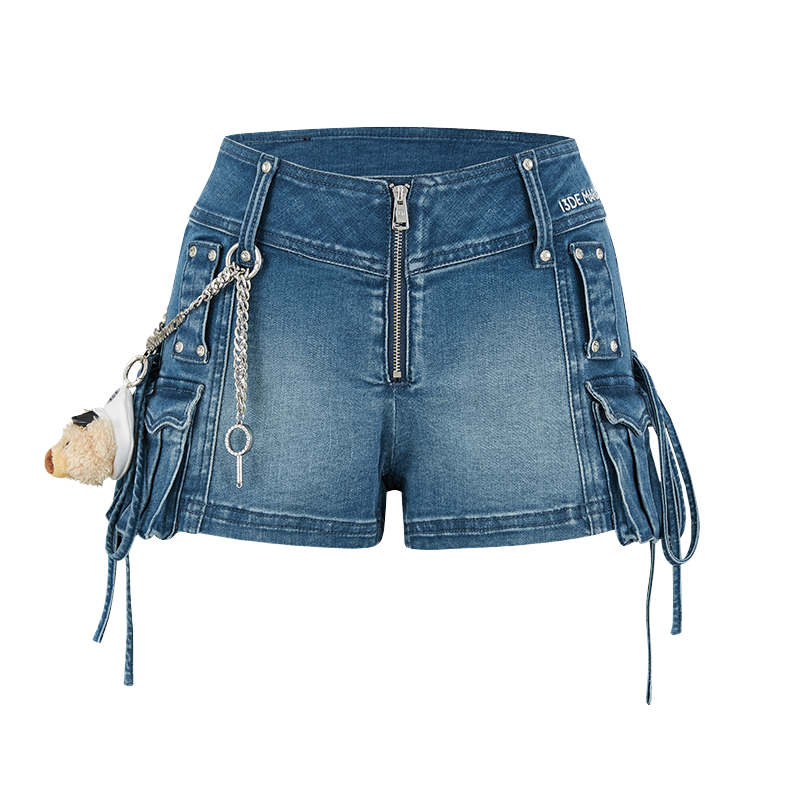 These V-waist denim shorts masterfully balance utilitarian edge with everyday wearability. The V-shaped waistline elegantly sculpts the waist-to-hip ratio, using structural tailoring to define your silhouette. Crafted from a resilient stretch denim, they offer both comfort and shape retention, ensuring a secure fit for diverse body types. The utilitarian pockets nod to classic workwear functionality, while the addition of sparkling crystal chains fuses ruggedness with refined glamour, conveying a subtle, elevated allure. Combining practicality with avant-garde details, this piece transitions seamlessly between sharp, utilitarian style and contemporary, fashion-forward expression.